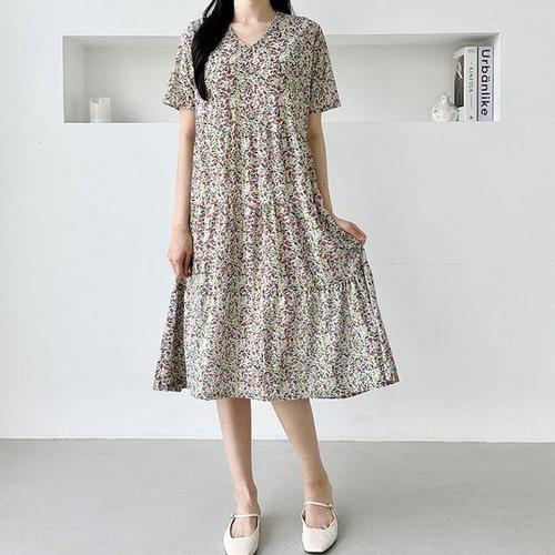 [에이치플러스몰]여성 데일리 여름 홈웨어 원피스잠옷 플라워 브이넥 반팔 원피스