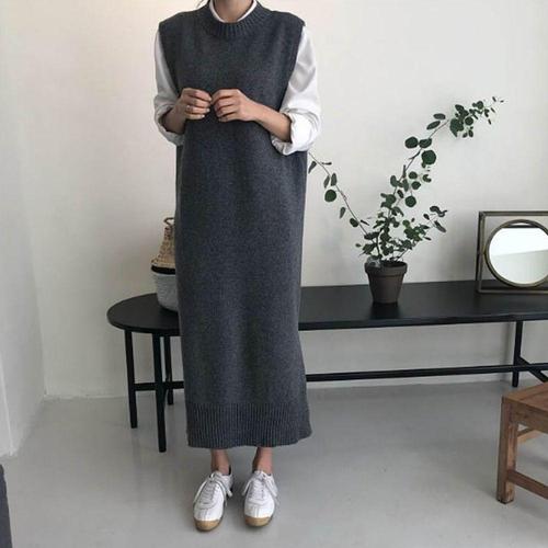 [문에이블]문에이블 여자 여성 봄 가을 간절기 루즈핏 브이넥 레이어드 데일리룩 니트 조끼 롱 원피스
