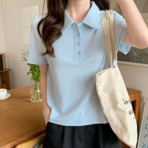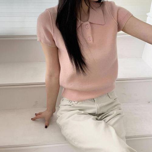 [옷자락] 여자 데일리 여리핏 카라 크롭 반팔 니트