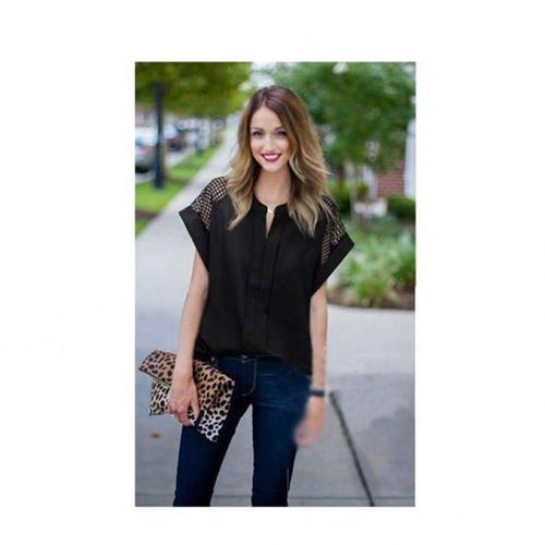LS24200 노카라 어깨 망사 시스루 반팔 V넥 블라우스 WFL8DE7