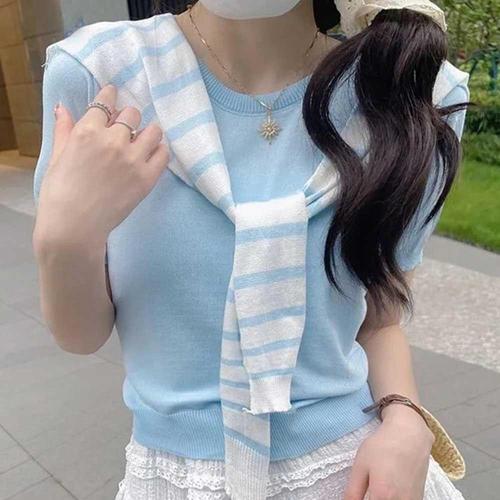 스트라이프 숄 세트 여름 데이트 룩 여자 반팔 니트 WFL0IEE