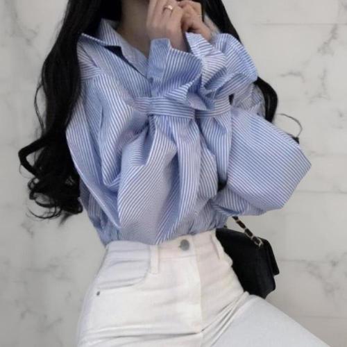 [옷자락]여성용 봄 여름 루즈핏 스트라이프 벌룬 셔츠