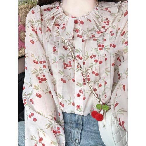 [신상오픈런]여성용 러블리 체리 패턴 핀턱 셔링 쉬폰 블라우스