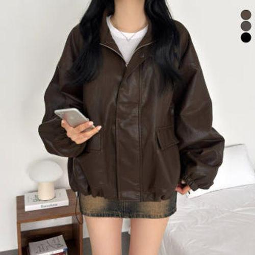 [이버유]여성 가죽점퍼 하이넥 오버핏 간절기 레더자켓