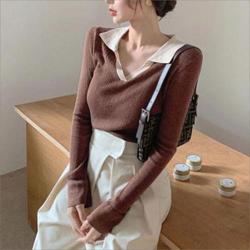 TKX 여성 니트 클래식 칼라 니트 긴팔 스웨터 가을 겨울 소프트 긴팔티셔츠 베이직 K87