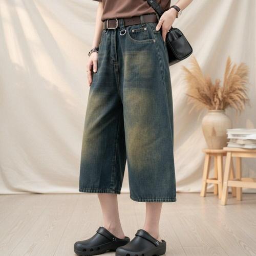 오스틱니 [날씬해보이는] 105kg까지 여성 겨울 빅사이즈 밴딩 롤업 밑단 수술 와이드 9부 청바지 봄 여름 통바지 슬렉스 진 연 블루 큰옷 여성의류 여자 데일리 캐주얼 데님 팬츠
