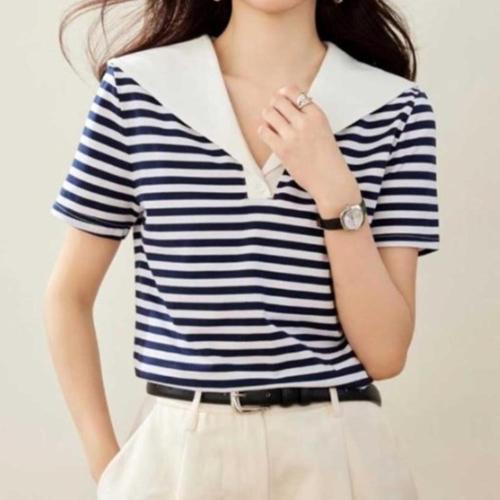 [미라클세븐]여성 스트라이프 카라 브이넥 반팔 티셔츠 트임 디자인