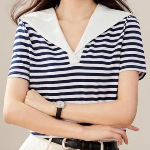[미라클세븐]여성 배색 스트라이프 크롭 카라 반팔 티셔츠 여름용 박스핏
