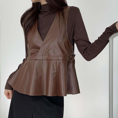 옷자락 / 여성 면혼방 터틀넥 긴팔티 가죽 뷔스티에 세트