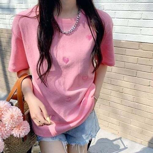 [셀럽하우스]여자 JEJI2980 데일리 스트릿 여름 편한 폴리 하트 자수 반팔티