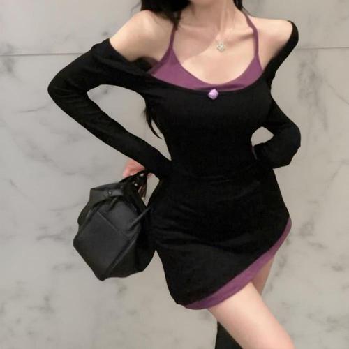 [옷자락] 여성 홀터넥 레이어드 슬림핏 언발란스 미니 드레스