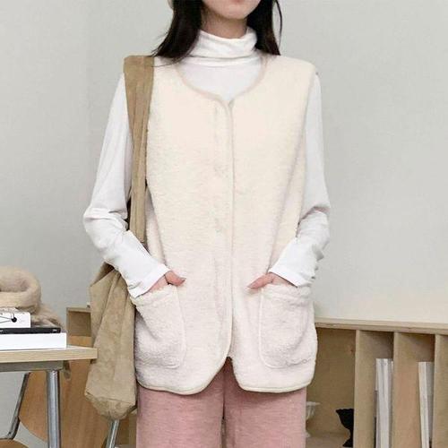 Destijl HC06 품넉넉한 디자인단추 주머니 브이넥 로즈 뽀글이 양털 조끼