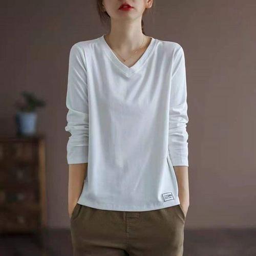 [에이치플러스몰]브이넥 솔리드 티셔츠 여름 긴팔 상의