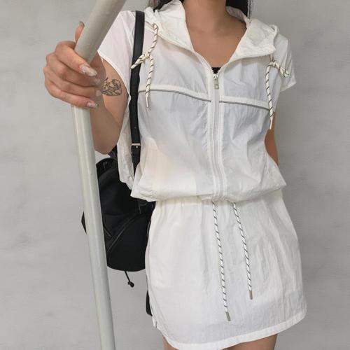 여성 후디 슬리브리스 미니스커트 나일론 세트