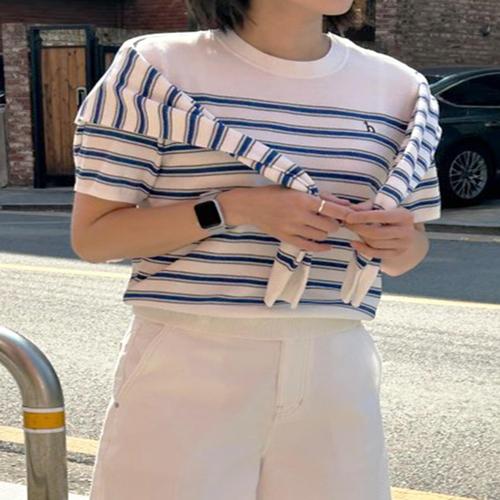 헤지스 여성 스트라이프 강연 셋업 반소매풀오버 블루 (HSSW5BC52B2)