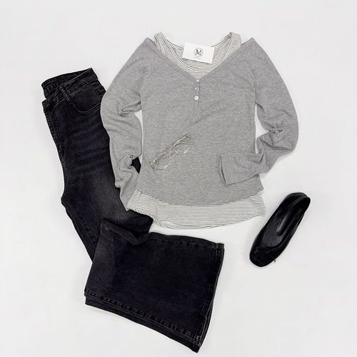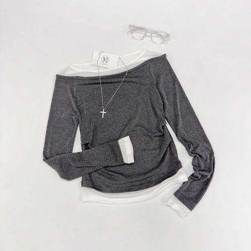 미즈큐즈 / 오프숄더 골지 배색 레이어드 슬림 긴팔티
