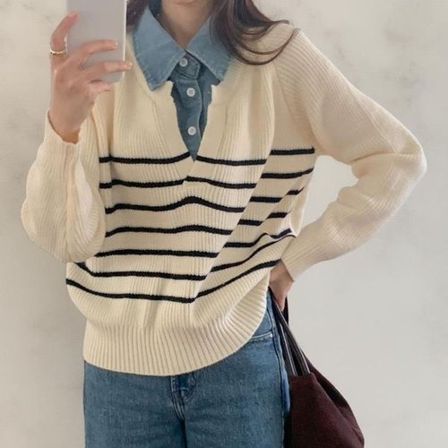 [옷자락] 여성 나그랑 스트라이프 청남방 레이어드 오버사이즈 니트