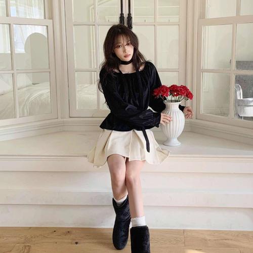|KHH4212|여성용 벨벳 리본 크롭 블라우스 연말 스타일