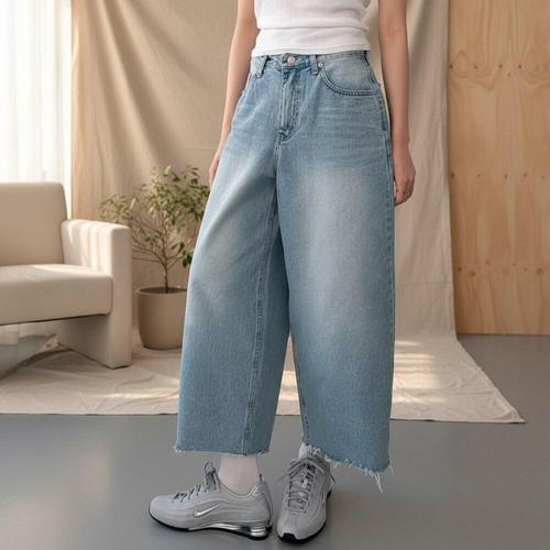 [옷자락]여성 와이드핏 벌룬 연청 데님팬츠