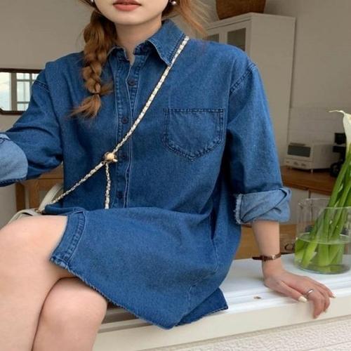 [셀러허브_여성트랜드패션]포켓 셔츠 롱셔츠원피스 연청 코디 스타일링
