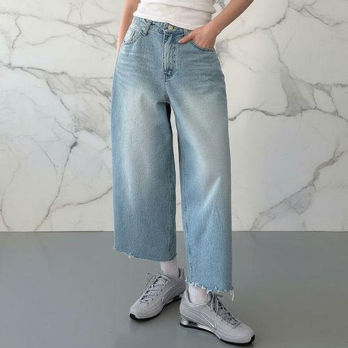 MADE 피넛진 데일리핏 연청 절개 와이드 크롭 데님 (one color)