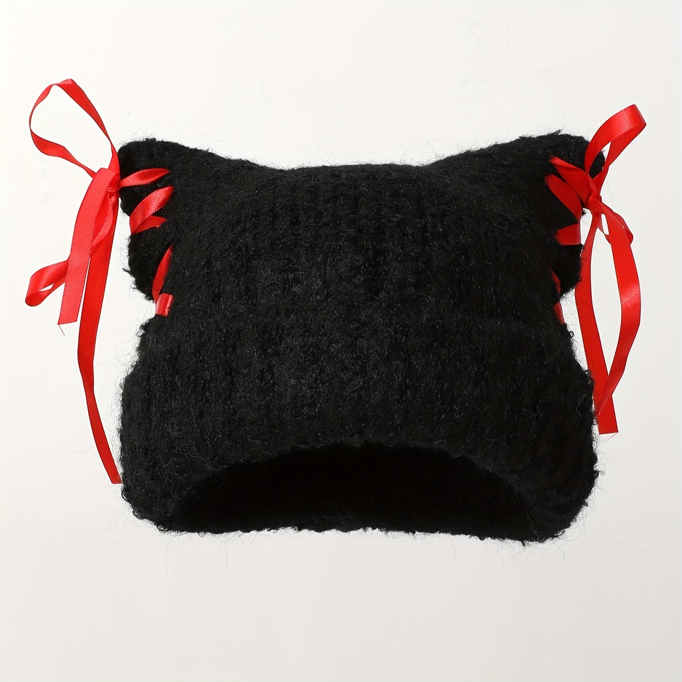 TEMU 레드 리본 장식이 있는 여성용 경량 비니 모자 - 캐주얼 및 정장용 블랙 겨울 따뜻한 스트레치 디자인, 스타일리시하고 편안한 착용감