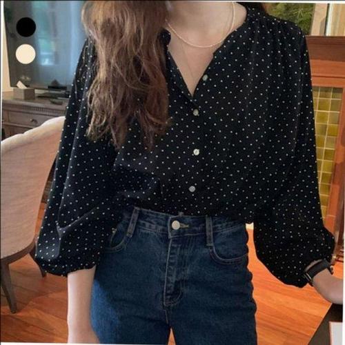 [에이치플러스몰]여성용프리미엄 프로셀러 원형넥 도트 밴드라인 탑 예쁜 롱슬리브 여성셔츠 캐주얼룩