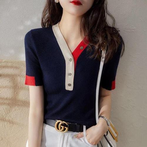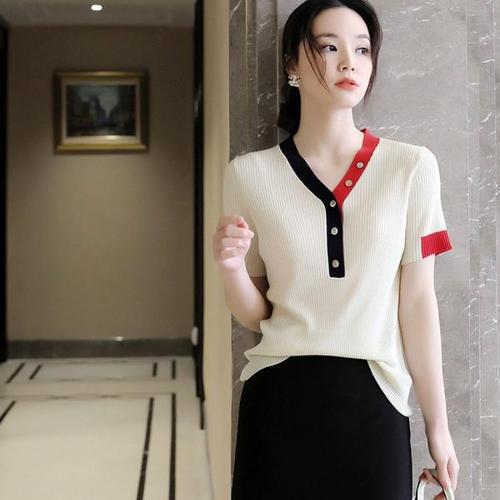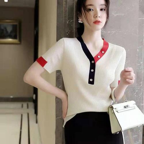 [오너클랜]인기상품 퓨어 배색 단추 니트 여자 예쁜 브이넥 반팔 셔츠 [WA97714_250917]