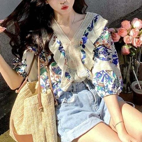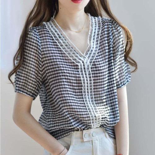 [셀럽하우스]브라우스 MKHC1509 반팔 블라우스 예쁜 프릴 브이넥 여성 여름