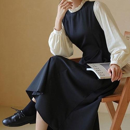 [엄지척]예쁜 벌룬 소매 여친 패션 A라인 블랙 롱원피스_19957385_667501