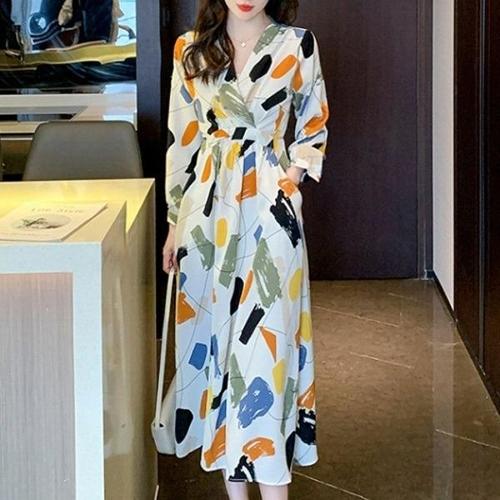 [엄지척]브이넥 랩디자인 허리끈 롱원피스 예쁜 컬러 프린트_19914304_667501