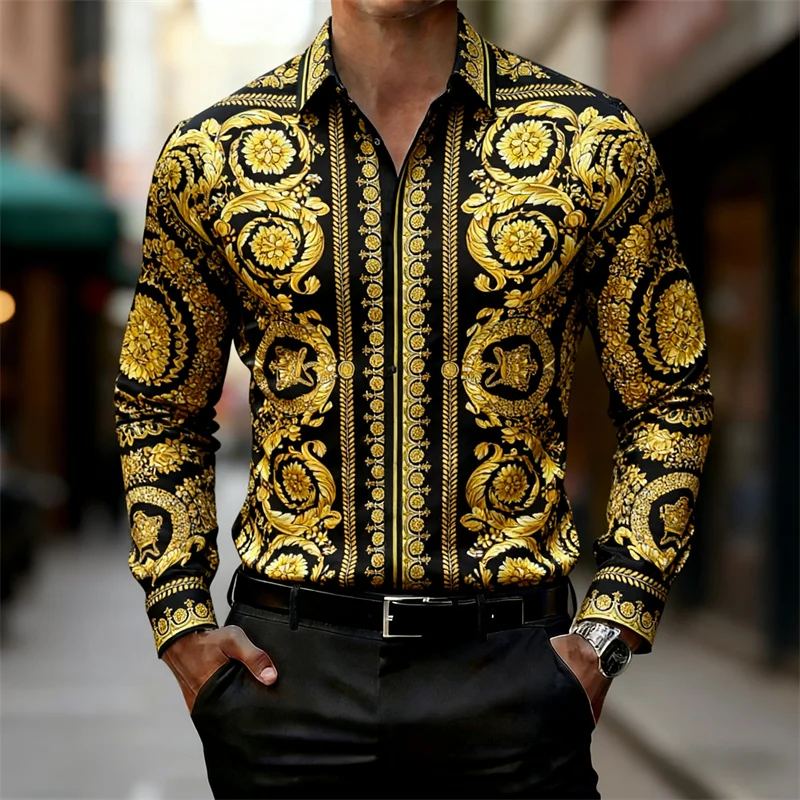 남성 셔츠 럭셔리 바로크 스타일 금색 패턴 긴팔 셔츠 패션 슬림 팰리스 HD 프린트 셔츠 알리익스프레스 핫 세일 XS-6XL