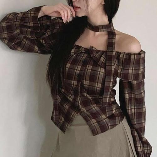 [디자이너몰]여성 초커 스트랩 오프숄더 체크 블라우스