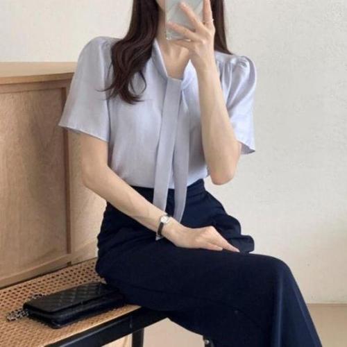 [신상오픈런]여성 기본 네크라인 리본 세미 반팔 셔츠