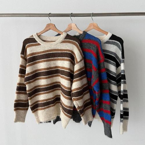 [옷자락] 여성 배색 오버사이즈 스트라이프 라운드넥 부클 니트