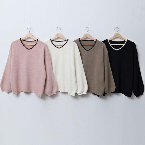 [옷자락]여성 분홍색 퍼프 브이넥 오버사이즈 니트