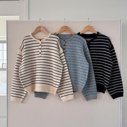 [옷자락]여성 반단추 라운드넥 스트라이프 오버사이즈 두꺼운 니트
