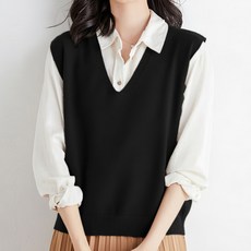 샵앤) 여성 배색 V넥 간절기 오버핏 레이어드 니트 조끼 BONG-WVS-4113-아이보리