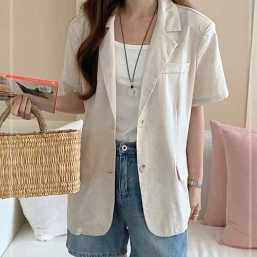 [르뚜앙]상냥 여름 린넨 반팔 브이넥 노카라 자켓 루즈핏 노카라 크링클 자켓 오피스룩 하객룩
