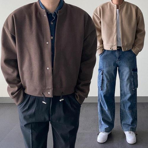 [모노폴로지]트위드 헨리넥 노카라 똑딱이 정장 크롭 단추 오버핏 겨울 스트링 미니멀 가디건 4color