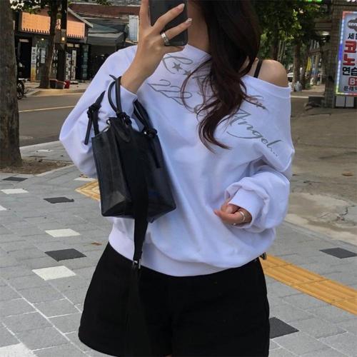 [옷자락] 여자 레터링 Y2K 언발 오프숄더 가오리 무채색 맨투맨