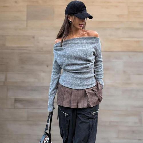 [신상오픈런]여성 슬림핏 기모 롱슬리브 오프숄더 티셔츠 드레이프 디자인