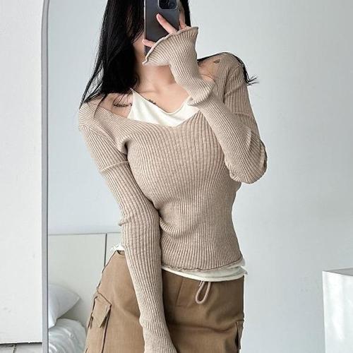 [신상오픈런]여자 옆셔링 오프숄더 롱슬리브 슬림핏 골지 티셔츠