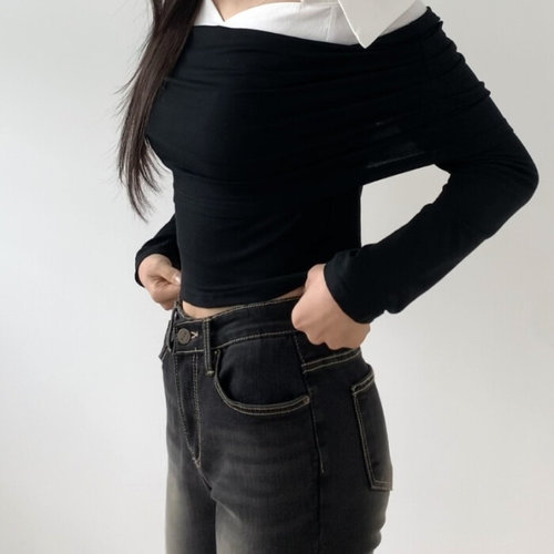 라라홀리 세미 오프숄더 청순 카라넥 허리 셔링 긴팔 셔츠