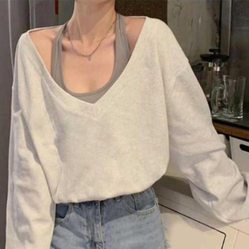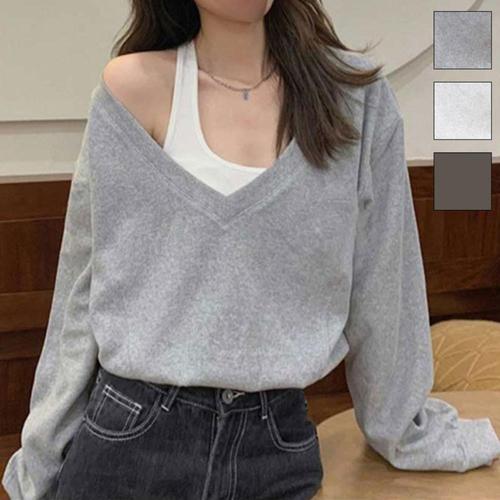 [옷자락] 여성 간절기 오프숄더 브이넥 느슨한 긴팔 티셔츠