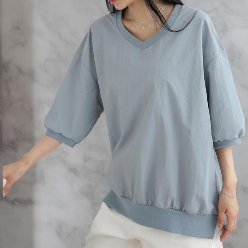 [옷자락] 여성 나일론 반팔 브이넥 슬릿 심플 여름 티셔츠