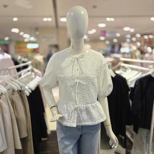 올리브데올리브 (OW5XB402) 엠보 텍스처 리본 볼륨 소매 블라우스