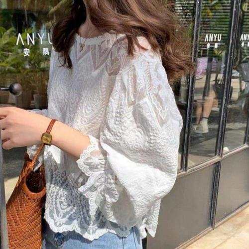 레이스 시스루 긴팔 셔링 여성 블라우스 흰색 WFLLQT1
