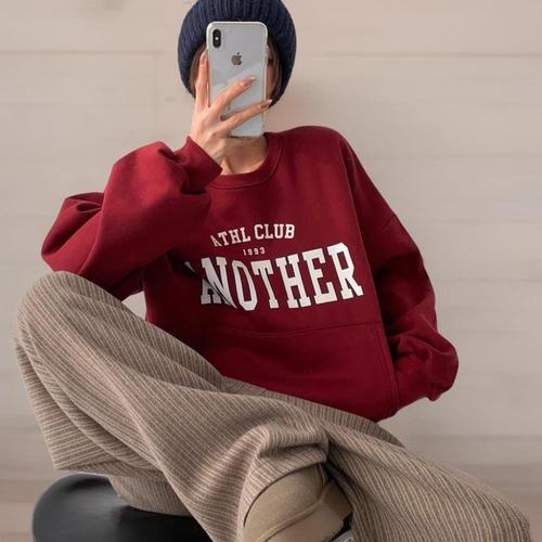 [옷자락] 여성 겨울 기모 맨투맨 와인색 캥거루 포켓 레터링 스웨트셔츠
