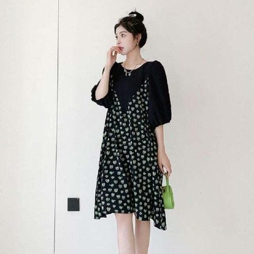 [모노무드]모노무드 LH-62704 그린 루즈핏 캐주얼 하트 미디 필수템 원피스 퍼프 데